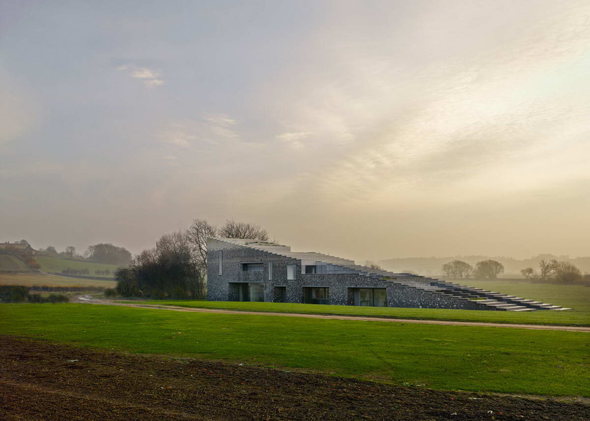 Проект стал победителем национальных и региональных премий: RIBA NATIONAL AWARD 2015, RIBA SOUTH AWARD 2015, RIBA SOUTH BUILDING OF THE YEAR 2015. Этот удивительный дом построен из местного камня (кремень) в живописном сельском районе недалеко от поместья Уоддесдон. Участок, где построен дом, имеет абсолютно равнинный характер и известен старинными месторождениями кремня. Идея проекта основана на контрасте равнины и каменного геологического «шва», образом которого и стал дом. Сам особняк состоит из двух частей — главного дома и гостевого. Оба здания плавно понижаются друг к другу. Основной удачей проекта стала фантастическая отделка наружных стен камнем, текстура которого плавно меняется по высоте, превращаясь из нарочито грубой внизу до гладкой меловой побелки вверху, формируя очень поэтический образ материала. Каменные работы выполнила компания The Flintman Company Limited. Название: Дом Кремень (Flint House)