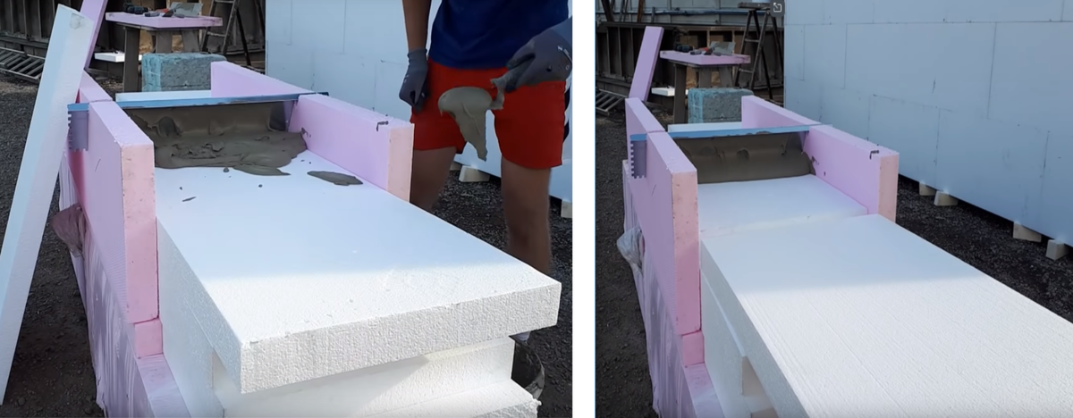 Пенопласт,пеноплекс, твердые ватные утеплители можно использовать в качестве наружного утепления. Есть много способов крепления их к стене, одним из них является крепление на специальный клей. Конечно если объемы не большие, то можно справиться простой гребенкой. Но если вам предстоит утеплять весь фасад, то стоит потратить 10 минут на изготовление приспособления которое в дальнейшем значительно облегчит ваш труд. Данная приспособа очень хорошо себя показала при нанесении клея на твердые утеплители, про вату ничего сказать не могу. Об устройстве: из листов пеноплекса с помощью саморезов и пены изготавливаем короб, в верхней части делаем пропил и устанавливаем гребенку. Гребенка должна быть длиннее ширины утеплителя. Принцип работы хорошо виден на фото, с одной стороны гребенки наливается готовый клей, дальше вторым листом пенопласта проталкиваем первый лист, в результате чего клей сам равномерно наносится на утеплитель. Этот процесс можно делать бесконечно долго, просто добавляя следую