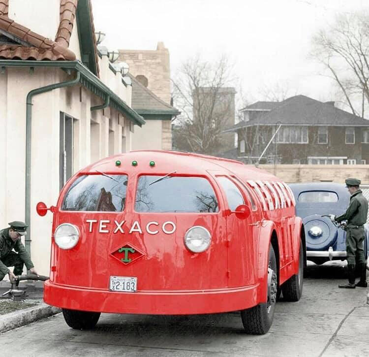 Если и есть в мире автомобилей что-то очень милое и забавное, словно мультяшка, то это цистерна, созданная по заказу нефтяного концерна Texaco. Этот грузовик можно считать самой необычной топливной цистерной, которая когда-либо использовалась по прямому назначению. Чтобы реализовать смелую задумку, нефтяная корпорация обратилась к команде крупнейшего теоретика и практика футуродизайна — Нормана Бела Геддеса. И они не подкачали: грузовик получился крайне необычным даже по сегодняшним меркам. Топливозаправщик Texaco отличалась от других грузовиков того времени буквально каждой деталью. У него не было крыльев, капота и подножек, а кабина и задняя часть имели полукруглую форму. В основе было шасси грузовика Diamond, от которого, впрочем, взяли немного: лишь двигатель и 4-ступенчатую коробку передач. Всё остальное было сильно модифицировано или вовсе создано с нуля. Двигатель переехал в заднюю часть, что оказалось очень удобно для привода топливоперекачивающего насоса. В глаза также бросалс