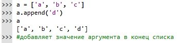 Метод append вставляет в конец исходного списка значение аргумента.