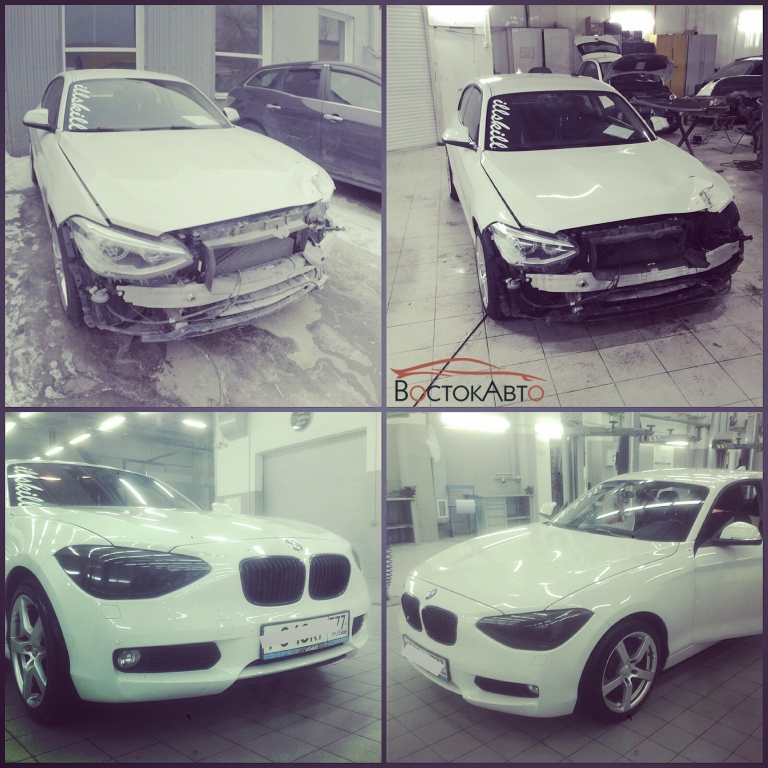 В техцентр «Восток Авто» (Москва) часто обращаются автовладельцы, попавшие в ДТП, поскольку у нас есть все условия для проведения высококачественного кузовного ремонта. На данных фотографиях представлен процесс ремонта приятной BMW 1 серии, владелец которой попал в неприятную ситуацию и «догнал» автомобиль, который ехал перед ним. Для того, чтобы финальный результат кузовного ремонта полностью удовлетворил Клиента, а автомобиль обрел первозданный вид на многие годы, важно с самых первых минут подходить к вопросу ответственно и внимательно. Первое, с чего начинают процедуру кузовного ремонта в техцентре «Восток Авто» - это тщательная дефектовка и определение степени повреждений всех деталей, поиск скрытых повреждений, которые невозможно определить без частичной разборки автомобиля. В данном случае повреждения довольно легкие – геометрия кузова этого BMW 1 series не пострадала, необходима лишь замена и окрас бампера, капота, головной оптики и подкапотной пластиковой «мелочевки». Особое