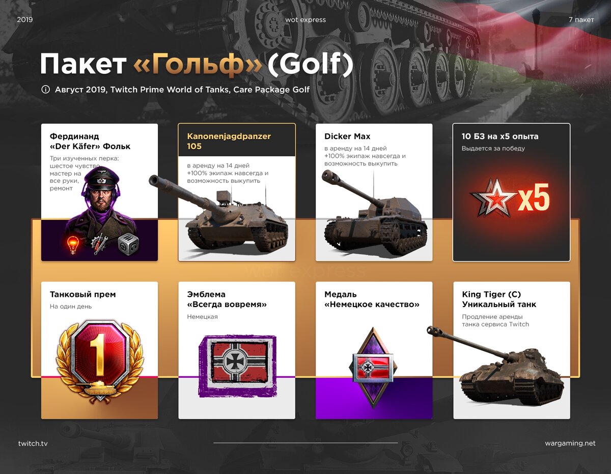 Пакет идёт в немецкой стилистике, всё его содержимое соответствует. Самый полный состав набора: Это всё содержимое за август месяц. Сражу же к изменениям: По подключению всё осталось абсолютно также, подробнее читайте в нашей статье: https://wotexpress.info/clauses/twitch-prime-world-of-tanks-avgust-kak-poluchit-7-/ Подпишись на канал, оцени этот материал лайком, поделись с друзьями. И не забудь оставить свой комментарий. Самые свежие новости World of Tanks на нашем сайте: wotexpress.info