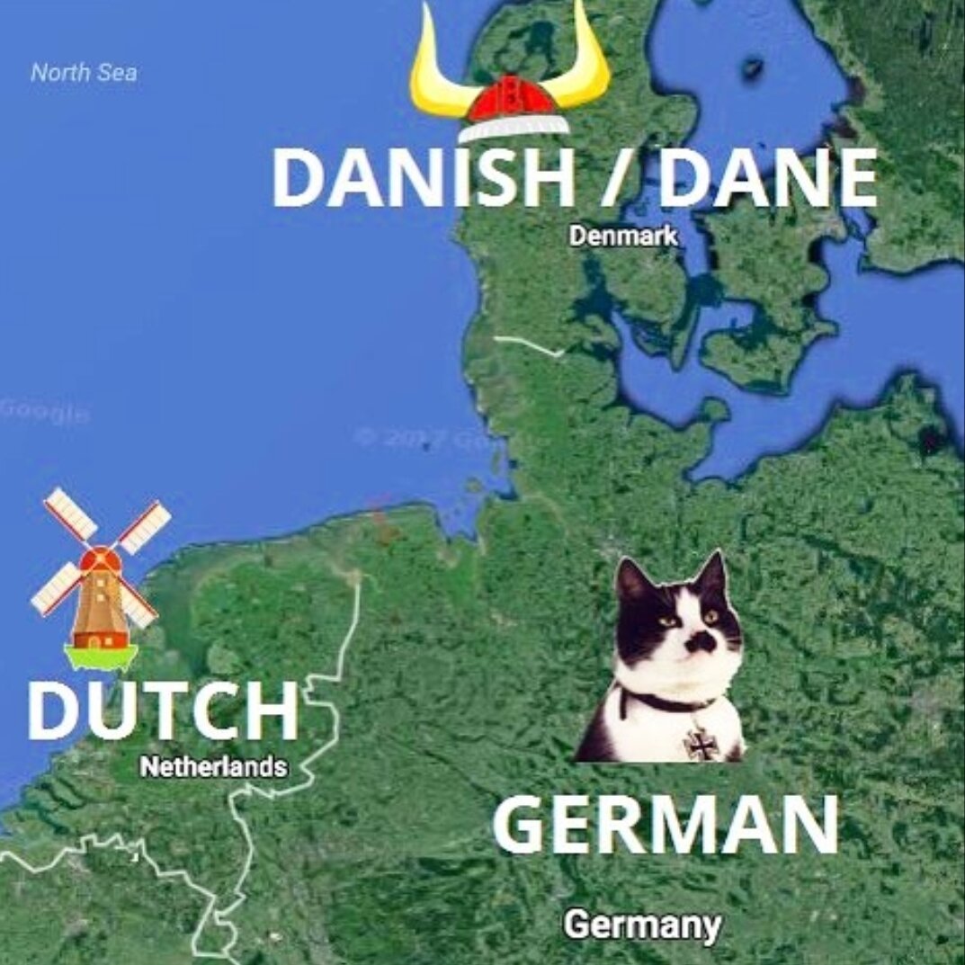 ...запомнить, что DUTCH — это голландский. Ну или нидерландский — как вам нравится. Даже если из перевода фразы с DUTCH это неочевидно: My old Dutch — моя старуха (о жене); She talks like a Dutch uncle — она разговаривает в назидательном тоне. Эпоха англо-голландских войн оставила на память: Dutch bargain — сделка, выгодная только одной стороне; Dutch agreement — соглашение, выгодное только одной стороне; That beats the Dutch — это превосходит всё. Однако практика показывает: слово DUTCH для русского человека со средним уровнем английского продолжает оставаться загадкой. Сталкиваясь с DUTCH, кто-то логично предполагает, что это слово переводится как «датский», а кто-то — «немецкий». Вот простая карта, которая поможет разобраться в наименованиях трёх родственных народов: немцев, датчан и голландцев. Если кому-то от этого станет легче, то мы не одни их путаем: в Америке диаспору пенсильванских немцев всю дорогу называли Pennsylvania Dutch с твёрдым убеждением, что это — корректный анг