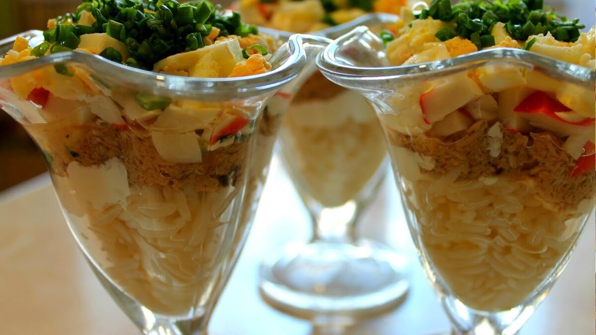 Друзья, всем привет! Я рада видеть вас на своем канале! И, сегодня, вместе с вами, хочу приготовить один очень интересный, оригинальный и вкусный салатик. Называется он “Новенький”. В моей кулинарной книге он появился недавно. Я готовила его для гостей, и вы знаете, каждая хозяйка за столом попросила у меня рецепт этого салата. Поэтому, я с большим удовольствием, хочу с вами поделиться этим простым, но в тоже время очень оригинальным рецептом. Для данного салата нам понадобится четыре отварных яйца, зеленый лук, майонез, майонез призываю вас взять с высокой долей жирности. Дальше нам понадобится баночка тунца, я беру измельченных в масле для салатов. Затем нам понадобится рис, риса грамм 100-150, рекомендую взять рис который готовится прямо в пакетиках, мне кажется, он всегда получается рассыпчатым и наиболее вкусным. Затем нам понадобится крабовое мясо, я люблю готовить такие салатики не из крабовых палочек, а именно из крабового мяса, мне кажется, оно вкуснее. Добавляем соль, перец