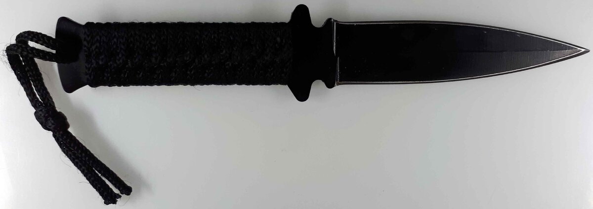 Привет всем! Сегодня изучаем нескладной кинжал с маркировочными обозначениями «BEKIZO». Производитель неизвестен, страна происхождения вероятнее всего Китай. Приобретался давно в обычном киоске без документов. Кинжал общей длиной 222 мм, цельнометаллический, выполнен из металла серого цвета с покрытием чёрного цвета. Клинок длиной 119 мм, наибольшей шириной 30 мм, наибольшей толщиной 2,8 мм, отношение длины клинка к ширине составляет 3,9:1. Клинок имеет два симметричных лезвия, образованных двусторонними заточками шириной до 15 мм. Продольное ребро жёсткости, образованное сопряжением граней клинка, отчетливо выражено. Колющее острие расположено на продольной оси ножа, угол схождения острия клинка 55 градусов. На пяте клинке имеется маркировка – изображение орла и надпись «BEKIZO», ниже ещё какие-то обозначения, но нечитаемые. Твёрдость клинка – 52 HRC. Клинок достаточно прочен и упруг (при отгибании острия на 10 мм, остаточной деформации не наблюдается). Хвостовик клинка о