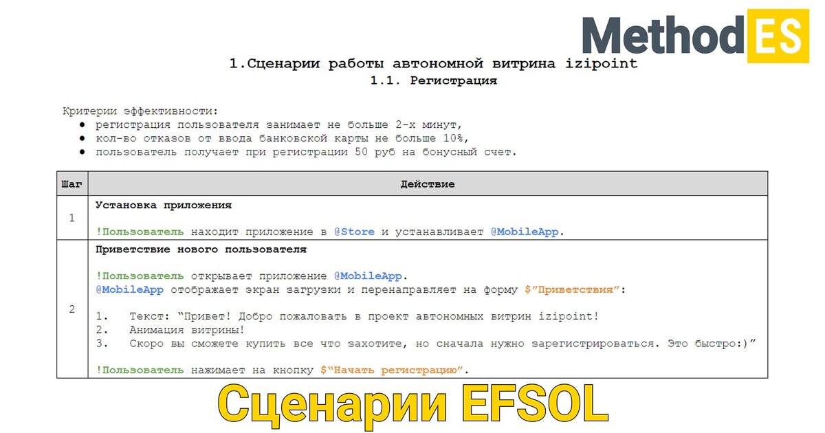 Приветствую!😉 Мы продолжаем расcказывать про метод EFSOL и сегодня поговорим о его наиболее значимой составляющей - сценариях EFSOL.🎬 Сценарий EFSOL - это унифицированное описание бизнес-процесса в формате последовательного изложения действий, выполняемых задействованными в нем субъектами и объекта. В сценариях применяются определенные правила структурирования и оформления текста. Для того, чтобы лучше их продемонстировать, давайте рассмотрим пример: Создание документа “Заказ клиента” Критерии эффективности: 100% товаров для отгрузки клиенту отражены в документе “Заказ клиента”. !МенеджерПоПродажам заходит в раздел $Продажи/ЗаказыКлиентов.