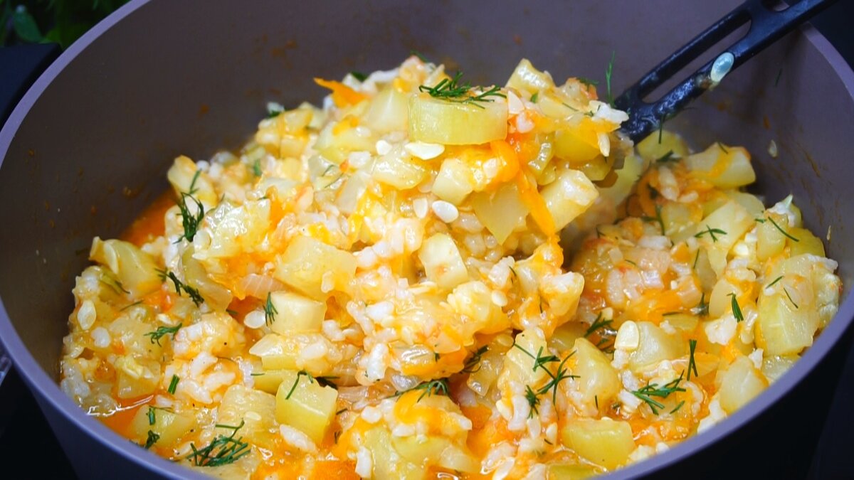 Перемешиваем, убавляем огонь и тушим все вместе до готовности риса примерно 20-30 минут. Порежем зелень укропа. К уже готовому овощному рагу добавляем 2-3 зубчика чеснока пропущенных через пресс, зелень, черный перец, пробуем на соль если нужно добавляем.