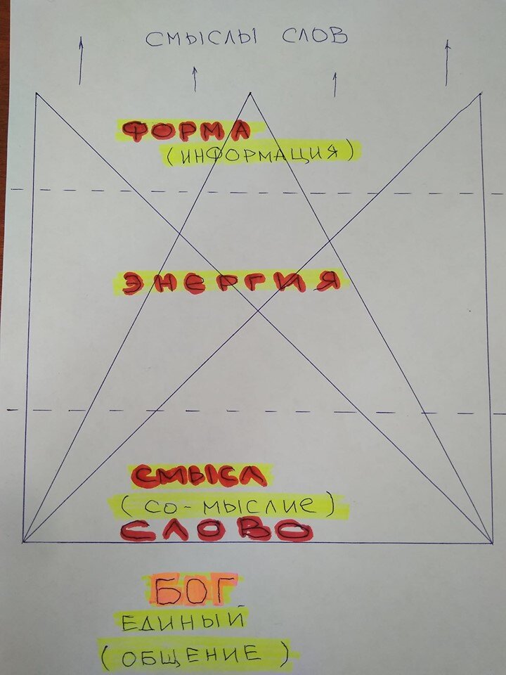 Со временем частого возвращения к этой схеме, для меня стало очевидно, что любая форма (от атома до человека и всего космоса) может быть представлена взаимоотношением этих трех уровней: «форма – энергия – смысл». Любая форма рождена энергией смысла. Исчезновение (разрушение) формы освобождает энергию, стремящуюся к новому проявлению. В этом есть преодоление смерти, Воскресение. «Рукописи (тексты) не горят».