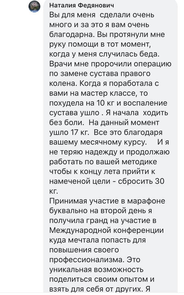 Сразу же после мастер-класса ушло около 10 кг веса. Клиентка начала ходить без боли. Но главное — больше нет воспаления сустава, и потребность в операции отпала сама по себе!