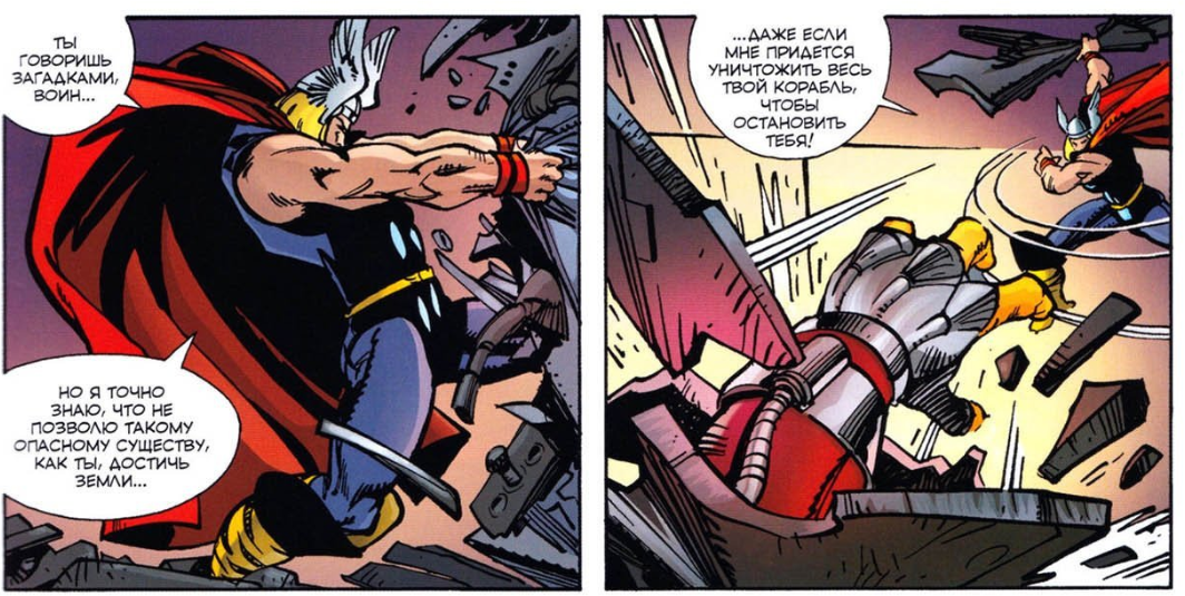 С вами канал comics. Мы продолжаем рассматривать историю происхождения невероятного оружия, которым Тор пытался одолеть Таноса. ...На борту космического корабля, который стремительно приближался к Земле, происходил ожесточенный поединок. В момент очередной атаки со стороны Рэя, Тор теряет свой молот, это приводит к тому, что к нему возвращается его истинный облик. Ведь если на Земле Дональд остаётся без волшебного посоха или молота, то он не сможет стать Тором или хотя-бы удержаться в могучей оболочке. Рэй очень быстро одолел Блейка и намеривался отражать атаки на Земле от инопланетной (для него) расы. Единственное оружие, которое его впечатлило был молот Тора, однако молот он так и не обнаружил, а первое, что попалось ему на глаза, был посох. Как вы помните, для того, чтобы "активировать" силу Бога Грома, нужно было всего лишь стукнуть волшебным посохом о землю. Всё это сработает только тогда, если держащий этой посох достоин божественной силы. И, Бета был таковым! Бета-Рэй Билл