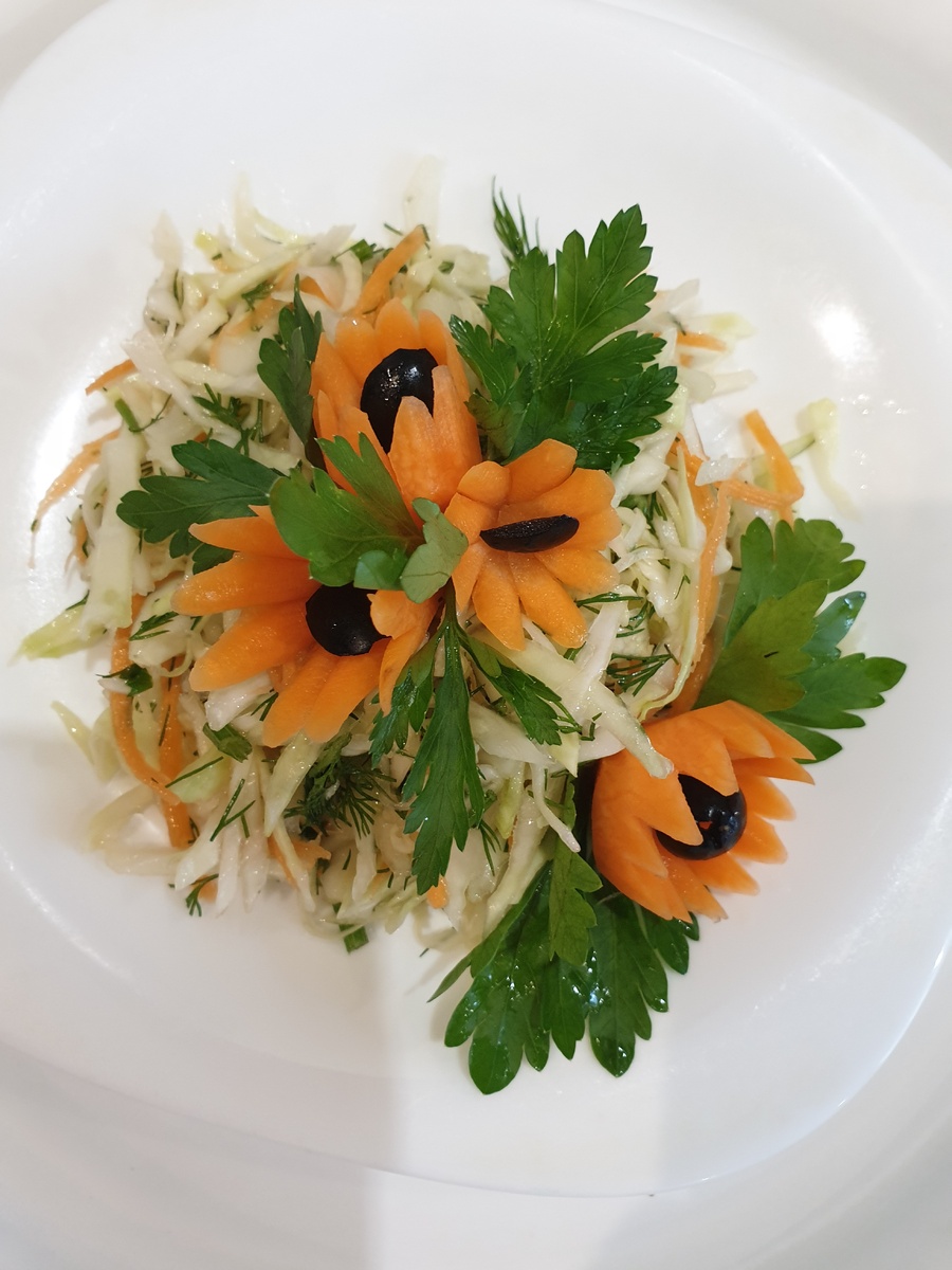 Белокачанную капусту чистим, убираем верхние листья, моем, нарезаем соломкой, кладем в миску. Чистим и моем морковку, нарезаем также соломкой, можно через терку, я сама всегда режу тонко соломкой, и добавляем к капусте. Немного мнем руками, чтобы стала мягкой. Добавляем мелко нарезанную петрушку и укроп, соль, сахар по вкусу. Выдавливаем немного сока лимона и заправляем маслом растительным. Выкладываем на тарелку, украшаем цветами из карвинга. Любое блюдо, красиво украшенное, поднимает настроение, повышает аппетит. Блюдо и украшение, которое его дополняет, должны сочетаться друг с другом. Украшение для блюд надо вырезать аккуратно, четко, чтобы они выглядели красиво. Цветы из моркови и листья можно употребить в месте с салатом.
