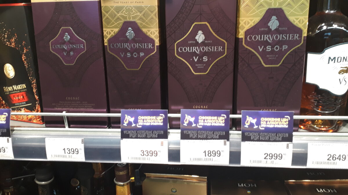 Всем привет! Сегодняшний обзор о Крепких напитках в супермаркетах сети Перекресток. Ценники пестрят красивым выражением -" снижение цен на алкоголь, Это надо отметить". По факту, цены конечно немного снизили, но сильно недостаточно. Французский коньяк Курвуазье. По выдержке формата ВС, в принципе уже неплохие цены. В Ленте такие по жёлтым акционным ценникам. Если вдруг нужен коньяк, то теперь можно взять и в Перекрестке, проезжая мимо. Remy Martin VSOP снижение цен на алкоголь в Перекрестке не коснулось. 4399 рублей за 0,7 литра - дорого. Рядом стоит также французский коньяк Камю ВС. 1999 рублей за бутылку объемом 0,7 литра. Это уже получше, у импортера в сети магазинов Винлаб он так и продаётся, но тоже со скидкой. Camus VSOP и Baron Otard VS - не сильно очаровывающие французские коньяки. К цены Где ты На грани, 3499 и 2199 руб соответственно. Обе бутылки объемом 0,7 литра. Remy Martin 1738 Accord Royal. Здесь конечно же имеет место не снижения цены, а наоборот повышения. Около года