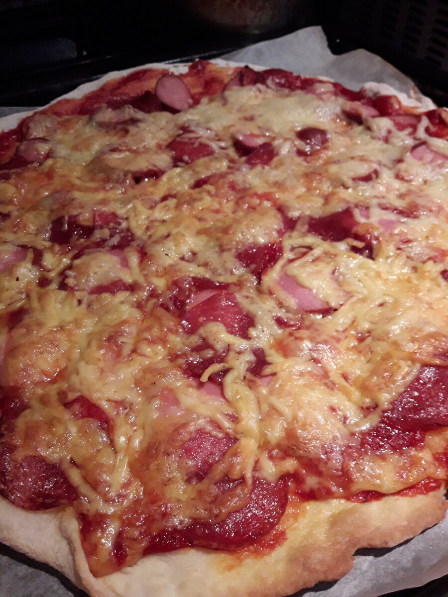 Когда ты работающая мама, то времени на долгие приготовления нет, а порадовать своих домочадцев вкусняшками все же хочется! Итак время приготовления 30-35 минут. Ингредиенты: Яйцо - 1 шт. - 5 руб. Мука - 1 стакан - 7,8 руб. Молоко - 0,5 стакана - 10 руб. Соль - 0,25 ч.л. Кетчуп - 10р. Колбаса - 50 р. Сыр -50р. Ну и все то что найдете в холодильнике =) 1) Делаем тесто: смешать 1 яйцо, мука 1 стакан, молоко 0,5 стакана и соль 0,25 ч.л., после смешивания всех ингредиентов получится не липкий колобок, который можно катать скалкой. (Если вдруг остается липким то добавить муки). 2) Раскатываем колобка в форме пиццы 3) Перекладываем форму на противень 4) Мажем кетчупом и выкладываем все ингредиенты, которые нашли в холодильнике (помидоры, сосиски, колбаса...) 5) Посыпаем сыром 6) отправляем в разогретую духовку 150-180гр. на 20 мин. Вуаля все сыты и счастливы! Текст: Малич Виктория Иллюстрации: Малич Виктория