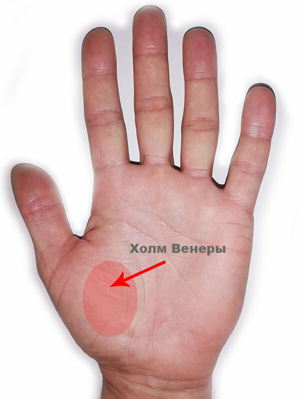 Холм Венеры назван в честь богини любви в римской мифилогии. Холм расположен у основания большого пальца и по площади занимает около трети ладони человека. Холм, имеющий положительные коннотации, мягкий и розовый. Холм Венеры является показателем следующего: Любовь; Семья; Мораль; Чувственность; Страсть. Средне развитый холм Венеры показывает, что вы симпатичны, нежны и богаты чувствами. В таких людей легко влюбляется противоположный пол, что позволяет наслаждаться удачей в любовных отношениях. Чрезмерно развитый холм Венеры указывает на то, что вы энергичны и сексуальны. Тем не менее, вы легко можете попасть под зависимость от своего настроения. Если холм слаборазвитый, вы обычно хладнокровны. Кроме того, вы не любитель романтики. В том случае, если увеличился размер холма Венеры, а его цвет приобрел насыщенный розовый оттенок, то это можно интерпретировать как появление в жизни человека, насыщенного и яркого любовного романа. Также это является показателем устойчивости человека к