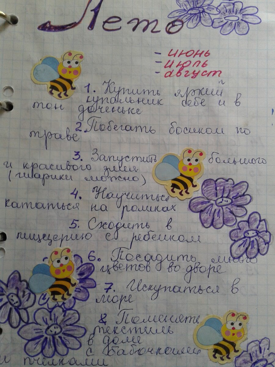 Список дел на лето: 100 идей! Составлять списки дел я начала 5 лет назад и поверьте это занятие увлекательное и полезное. Я вношу все идеи мероприятий и событий, о которых мечтаю, что необходимо мне и моей семье... и поверьте реальность выполнения, воплощения в жизни увеличивается. Вашему вниманию я предлагаю список дел на это лето. Мои идеи для вдохновения...Потом я обещаю о некоторых я расскажу, как я их во платила...