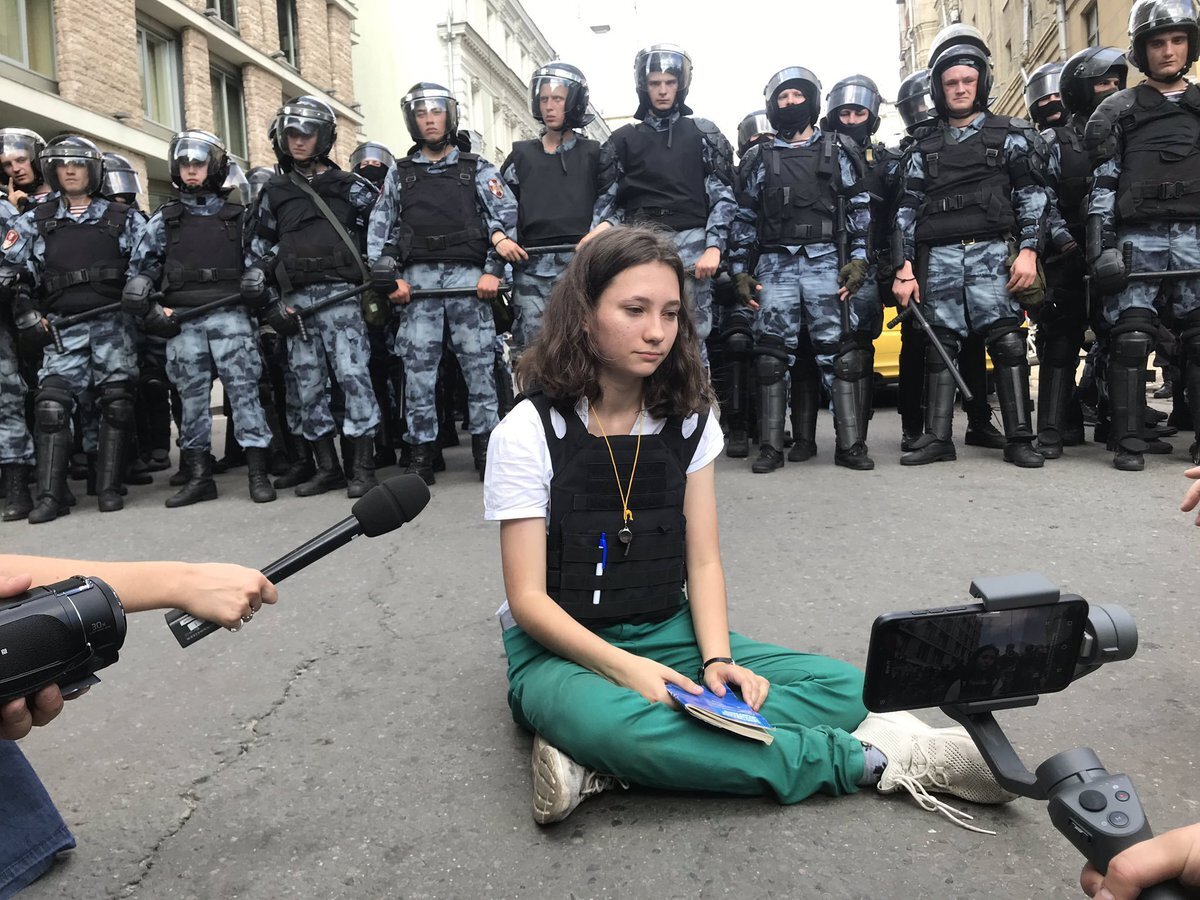 Она одинокая девушка-подросток, сидящая со скрещенными ногами и вооруженная не чем иным, как российской конституцией. Это линия общеизвестно жестокой московской ОМОНа, оснащенная щитами, дубинками и шлемами. Но образ молодого демократического демонстранта, единолично бросающего вызов силам безопасности Владимира Путина, похоже, станет одним из самых мощных символов сопротивления президентской автократии. Ольгу Мисик, 17 лет, сфотографировали, сидя перед офицерами, зачитывающими конституцию страны, которая подтверждает право на мирные собрания, во время протестов в субботу. Видимо, не зная, как справиться с таким проявлением спокойной наглости, полиция сдерживает. Изображение распространилось по всему миру, его распространяли тысячи раз, и мирное неповиновение, в центре которого находится фотография, слабо напоминает то, что присутствует на культовой картине танкиста на площади Тяньаньмэнь. В настоящее время она используется российской оппозицией, чтобы сплотить поддержку перед лиц