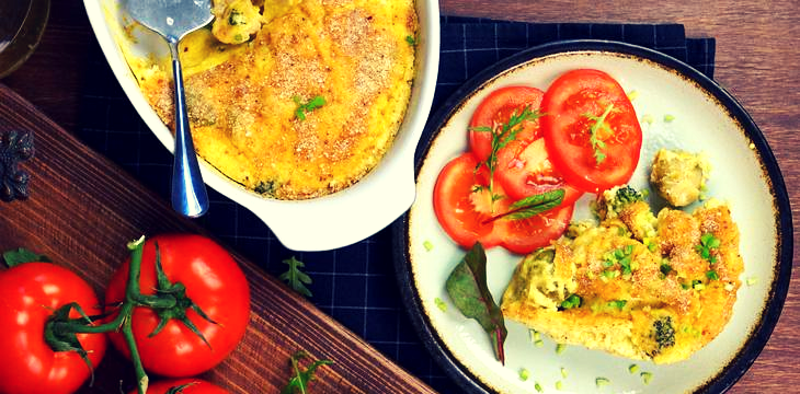 5. За это время смешайте взбитые яйца с молоком и специями. По истечению 15 минут полейте этой смесью овощи, а также присыпьте натертым сыром и запекайте еще 20 минут.