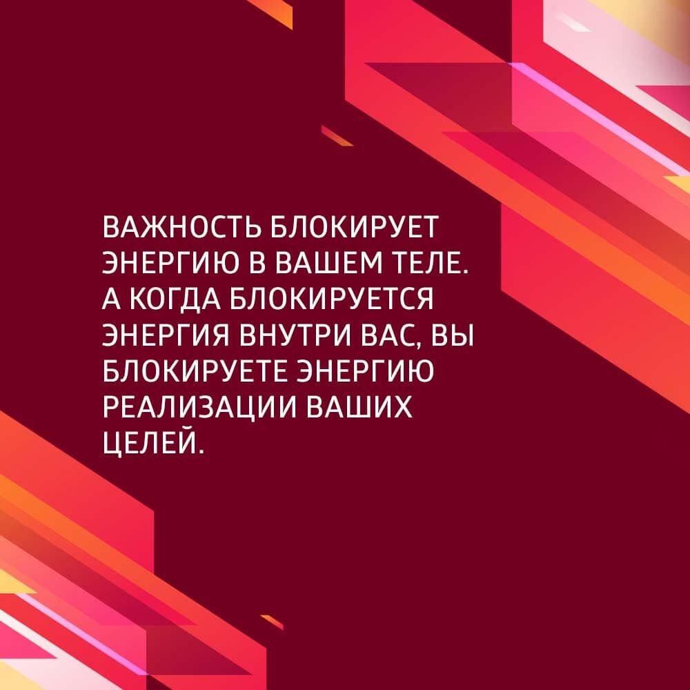 Когда вы придаете слишком большое значение какому-либо событию, переживаете из-за того, что оно может не произойти или, наоборот, стремитесь всеми силами его приблизить – вы таким образом завышаете важность. Опасность скрывается в том, что важность блокирует энергию в вашем теле, не давая энергии внешнего намерения (энергии Вселенной) свободно протекать через вас. В результате чего реализация вашего намерения значительно замедляется или и вовсе откладывается на неопределенный срок. Помните: завышая важность, вы блокируете энергию реализации ваших целей.