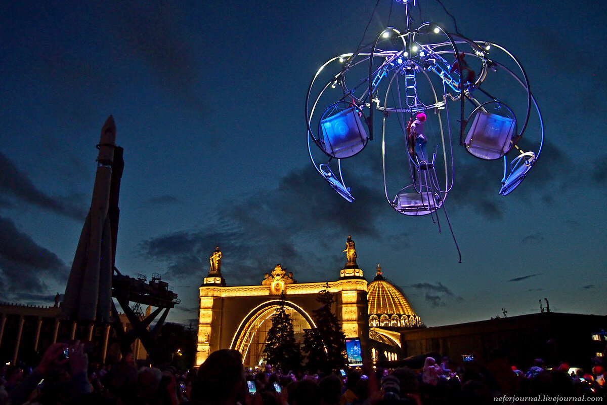 На фестивале "Вдохновение" театр Транс Экспресс показал феерический спектакль "Кинематика жидкостей". По-французски это называется "Mù - cinematique des fluides". Уникальная движущаяся конструкция, трюки на 15-метровой высоте, живой оркестр в воздухе, параллельно труппа артистов работала на земле, перемещаясь между зрителями. Они удивляют каждый раз.