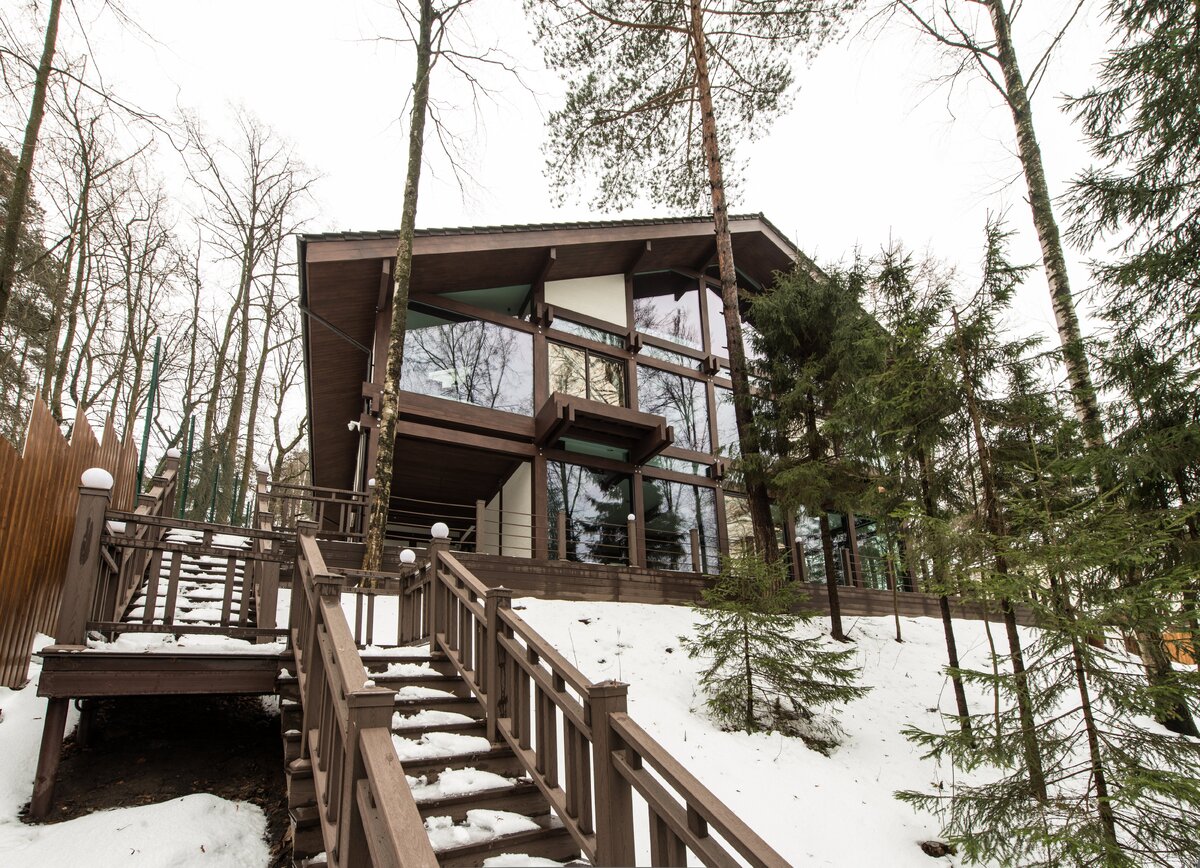 Дом, метраж 650 м2. Этот дом возведен среди хвойного леса, вблизи берега реки. Владелец - настоящий ценитель красоты природы. Он захотел дом, который будет дарить ему ощущение единения с природой, воздушности пространства и полной свободы. За основу был взят стиль фахверк в современном исполнении. Связь жилой среды с природой подчеркивает то, что дом практически на 70% состоит из стекла. Такая конструкция позволяет наслаждаться естественным солнечным светом и теплом даже в зимнюю пору. В результате использования деревянных колон и балок внутреннее пространство дома получилось максимально открытым и невесомым. Мы создали уникальное панно из ветвей дерева, которое привнесло в интерьер еще одну частичку природы. Дизайн интерьера дома выполнен в стиле комтемпорари. Общая атмосфера такого интерьера отличается аристократичностью, благородством и изысканным чутьём. В интерьере прекрасно сочетаются разные стили, потому что в контемпорари нет правил, а есть лишь гармония, функциональность
