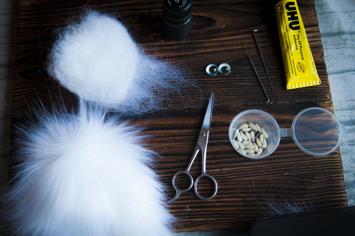 У меня вот такое овальное туловище из длинного меха (просто сшиты вместе две детали и набиты синтепоном, глазки, шерсть для валяния, иглы, клей, и зубы, которые я слепила из полимерной глины.