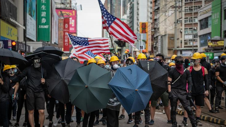 Так хочется верить дипломатам, особенно такой значимой в мире страны, как Америка. Помню, на Украине тоже поверили пять лет назад, правда, никак не могут разобраться с тем, что натворили гарантии Запада в этой стране, хотя украинцы продолжают верить в западные ценности. Хорошо, закрываю глаза и начинаю верить... Открываю и глаза и вижу: Ух, ты! Чистые боевики двигаются на встречу, организованы, экипированы для силового столкновения, а вдохновляет всю эту компанию звездно-полосатый признак свободы. Как же без него всемогущего и всевидящего, кажется, эту тему еще Сноуден поднимал и именно в Гонг Конге. Хотите возразить, что молодые люди опасаются непогоды, потому что будет сильный дождя, переходящий в град размером в теннисный мяч. Уговорили! Тогда подскажите к каким синоптикам отнести этого "Капитана Америку" в полной боевой выкладке, который ведет за собой на боевое столкновение с полицией. Сериалов американских насмотрелся или очень продвинутый геймер? Ладно, в Гонг Кон