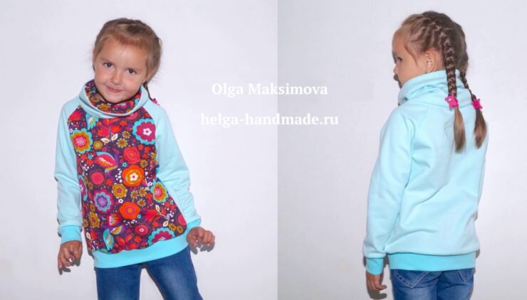 Лето на Урале заканчивается — пора утепляться. Сегодня покажу, как сшить толстовку/свитшот с высоким воротником (такой воротник ещё называют воротник-труба). Получился мягкий, тёплый и удобный свитшот из футера с начёсом. Футер мятного цвета заказывала в магазине «1 метр ткани» Выкройка свитшота на рост 80-134 см, идёт в размер, подойдёт мальчикам и девочкам. Кроим детали выкройки, прибавив на швы по 1 см с каждой стороны. Так как буду шить толстовку с высоким воротником, то в горловине прибавку на швы не делала. Для воротника кроим 2 одинаковые полоски. Длина полос равна обхвату головы, а высота на ваше усмотрение (у меня высота полос 15 см). Раскладываем полочку, спинку и рукава, как показано на фото ниже. На выкройке рукавов указано, какая сторона идёт к полочке. Пришиваем рукава к спинке и полочке. Отутюживаем швы. Складываем перед и спинку по плечевым швам и стачиваем боковые швы, где зафиксированы клипсы. Переходим к воротнику-трубе. Каждую полоску сгибаем и стачиваем в кольцо, г