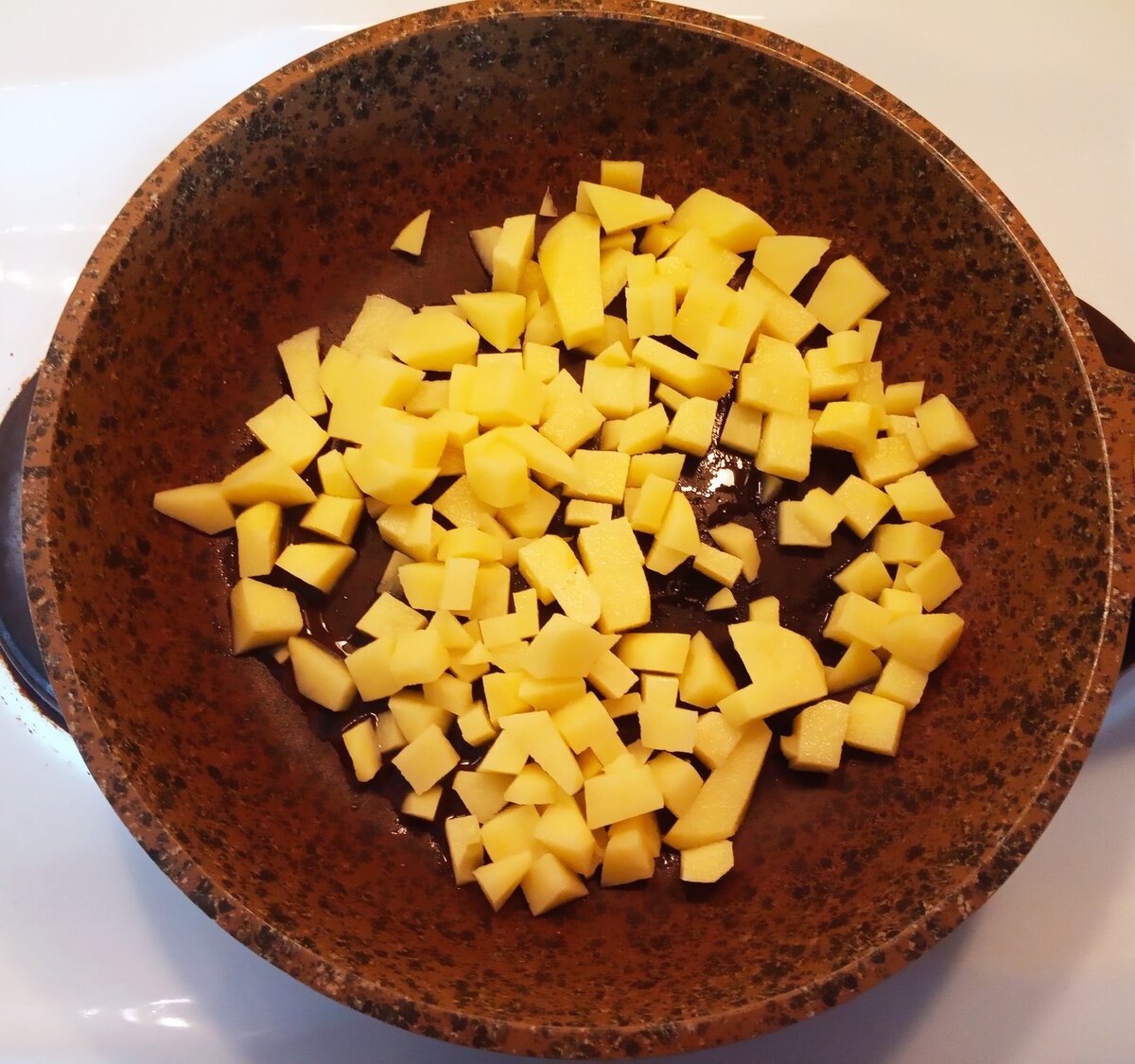 Самый сложный шаг в этой готовке — чистка и жарка картофеля. Щедро заливаем разогретую сковороду маслом и жарим картошку, порезанную кубика