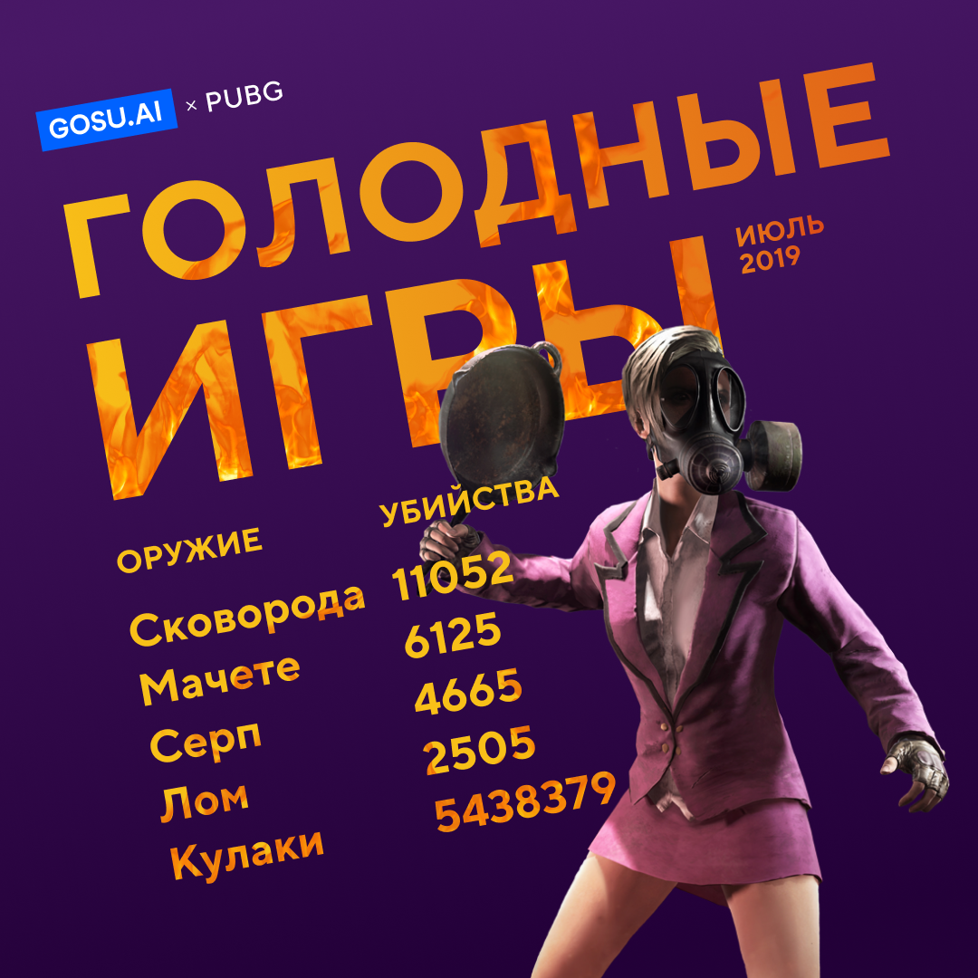 PUBG - это в своем роде “Голодные игры”, которые проводятся изо дня в день от матча к матчу с огромным количество участников! Игроки прекрасно понимают, что при приземлении с лутом везет “СИЛЬНЕЙШЕМУ”, и найти огнестрельное оружие зачастую удается не сразу. Но не стоит отчаиваться, ведь всегда есть возможность показать, кто "папка" в мили бою. 😉 Мы посчитали количество погибших игроков от разного вида оружияближнего боя, а также, сколько всего погибло игроков от умельцев помахать кулаками. За один только июль текущего года цифры довольно внушительные! Ни для кого не секрет, что сковородка — это талисман PUBG, поэтому совершенно неудивительно, что большая часть игроков пострадало именно от этого оружия - целых 11052 покалеченных. Второе место занимает Machete – 6125, третье Sickle – 4665 и завершает данную статистику Crowbar – 2505. А тех, кто проверил на себе разные боевые искусства внутри игры, 5438379 игроков. 🔥 Если вы не смогли быстро найти какое-либо огнестрельное оружие - не