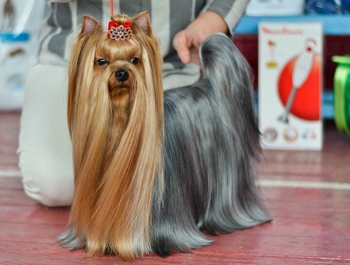 Добрый день мои дорогие читатели! Сегодня я продолжаю рубрику о йоркширском терьере. Вы купили себе счастье. Облачко радости со звонким лаем бегает по Вашей квартире и веселит своим присутствием. Мы подросли, окрепли, научились выполнять команды. Что дальше? Правильно! Идем завоевывать медали! Готовимся к выставке. Если Вы решили своего питомца показать на выставке, то этому предстоит долгая подготовка собаки к выставке. Подготовительная часть имеет несколько этапов: обучение питомца стойке, умению показывать зубки и грациозно двигаться по сцене. Так же важным моментом является создание прически для выставки. Стойку щенку возможно отрабатывать уже начиная с двух месяцев от роду. Наилучший вариант – отрабатывать перед зеркалом, на высоком столике, с положенной на него салфеткой из резины, чтобы лапы не скользили по столу. При этом нужно кормить любимца лакомством, чтобы он инстинктивно тянулся за ним, вытягивая шею. Обязательно хвалите щенка. В конечном итоге лапы, расположенные спер