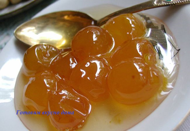 Алычу часто используют для компотов и как то не заслуженно забыли о том, что это та же слива, только маленькая и из нее можно готовить ароматнейшее варенье. Единственный недостаток у алычи - у нее плохо отделяются косточки, поэтому варенье будем варить с косточкой. Ингредиенты: алыча - 1 кг; сахар - 1 кг; вода - 100 мл. Способ приготовления: Алычу переберем, уберем хвостики, промываем в проточной воде и даем стечь воде. Воду нагреваем, всыпаем половину сахара, ждем пока сахар полностью растворится и даем пару минут прокипеть. Алычу складываем в кастрюлю, сверху поливаем сиропом, так чтобы все ягодки обдались горячим сиропом. Даем ягодам остыть. Всыпаем оставшийся сахар, аккуратно, как бы покачиваем кастрюлей, чтобы сахар растворился и ставим на медленный огонь. Ложкой не пользуемся, иначе ягоды расползутся. Как только варенье закипит, выключаем огонь и даем ему остыть 5-12 часов. По прошествии времени варенье кипятим 20 минут и опять даем ему остыть 5-12 часов. Последний раз кипятим