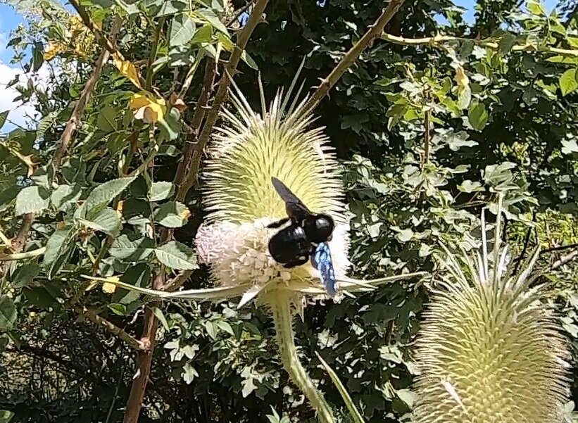 Пчела-плотник встречается в Крыму повсеместно, особенно в дикой природе. Названа так, потому что умеет прогрызать длинные ходы в древесине и откладывать там яйца. Сама на человека не нападает, но шутить с ней не стоит: укус болезненный. Укус в горло может быть смертельным, так как начинается аллергическая реакция, и человек задыхается. Эту пчелу я встретил при подъёме на гору Демерджи.