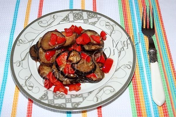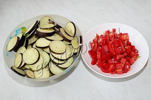 Баклажаны нарезать кружочками, а перцы - не мелкими произвольными кусочками. Лук нарезать как можно мельче. Сделать соус.