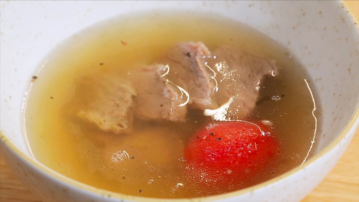 Достаем кусок мяса. Вырезаем из него всё съедобное, нарезаем небольшими кусочками и складываем в глубокую тарелку. Очищаем от кожуры один маринованный помидор и кладем в тарелку к мясу. Заливаем мясо и томат бульоном. Перчим. Хорошо отваренное мясо и крепкий бульон - простое, базовое, вкусное блюдо для тех, кто устал от гламурной кухни и огромного сочетания различных ингредиентов в блюдах.