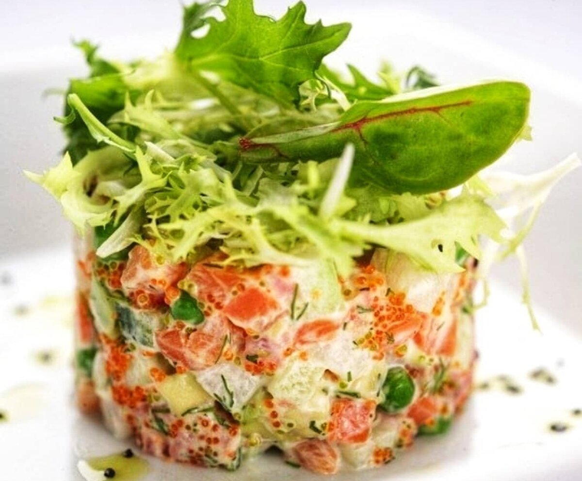 ¤ 300 г свежей слабосоленой семги, ¤ 5 картофелин, ¤ 3 яйца, ¤ 1 маринованный огурец, ¤ 2 свежих огурца, ¤ 0,5 баночки зеленого горошка, ¤ укроп, ¤ 1 луковица, ¤ 100 г красной икры (или икры сельди), ¤ сметана нежирная, ¤ руккола, ¤ соль и перец ⠀ 》Отварить и очистить картофель и яйца ⠀ 》Нарезать кубиками огурцы, лук, яйца и картофель ⠀ 》Выложить всё в миску ⠀ 》Филе семги нарезать небольшими кубиками ⠀ 》К нарезанным овощам добавь зеленый горошек и измельченную петрушку ⠀ 》Выложить семгу ⠀ 》Посолить и поперчить ⠀ 》Смешать 150 г сметаны с икрой и заправить полученным #соус'ом салат ⠀ 》Украсить рукколой. ⠀ Приятного аппетита! 🤗 ⠀ #салат #полезныйоливье #салатсрыбой #салатссемгой #семгавсалате #вкусныйоливье #полезныйсалат #еда #семга