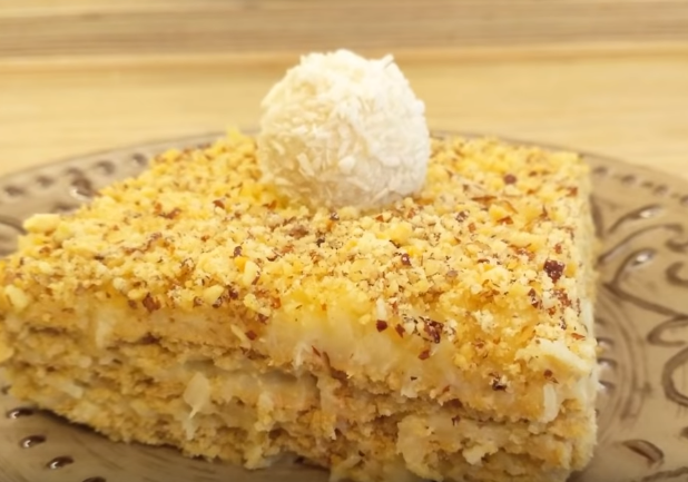 Верхний слой должен быть из крема. Сверху посыпать измельченным миндалем или печеньем. Так же можно кокосовой стружкой или натертым шоколадом. По желанию украсить конфетками. Убрать в холодильник на 3 часа, для пропитки.