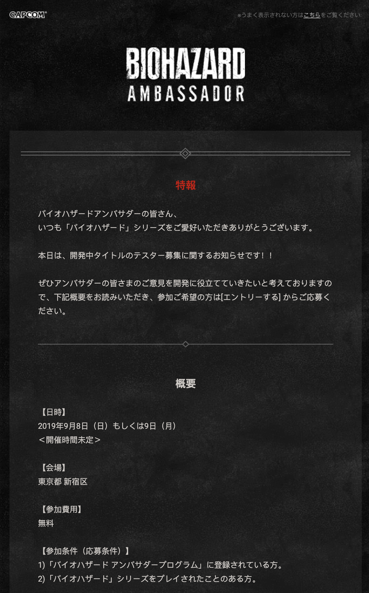 Подразделение Capcom, ответственное за разработку серии «Resident Evil» и «Devil May Cry», разослало электронное письмо для найма представителей «Resident Evil», базирующихся в Японии, в поисках «тестеров игр». Детали очень расплывчаты, но тесты будут проводиться либо 8 сентября, либо 9 сентября. Также указано, что нужно быть послом Resident Evil и человеком, который сыграл серию (в какой степени не указано). Всем представителям Resident Evil, Спасибо за ваше покровительство в отношении серии Resident Evil. Сегодня, мы даем вам знать, что набираем тестеров для игры, которая находится в разработке! Мы заинтересованы в том, чтобы включить отзывы всех представителей в нашу разработку, поэтому, пожалуйста, прочитайте подробности ниже и, если вы заинтересованы в участии, нажмите кнопку входа. В конце июня Capcom провела встречу представителей Resident Evil в Токио. Больше новостей у нас на сайте!