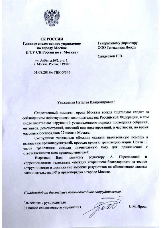 В адрес Генерального директора телевизионного канала «Дождь» был направлен официальный документ от следственного управления СК по городу Москве. В данный момент нет никаких данных о возбуждении уголовных дел, вынесенных предостережений или вызовов на допросы подозреваемых. Бесценным подарком для следствия стал эфир в течение 11 часов, который был успешно записан не пленку. Теперь его аккуратно изучают следователи и дознаватели. Официальная благодарность от СК выражена владелице медиахолдинга «Дождь» госпоже Синдеевой, а также главному редактору госпоже Переспеловой. Корреспонденты телеканала с успехом выполнили часть необходимой оперативной работы, освещая в прямом эфире действия нарушителей закона 27 июля 2019 года. Напомним, что в конце июля 2019 года в Москве прошли акции протеста с нарушением закона.