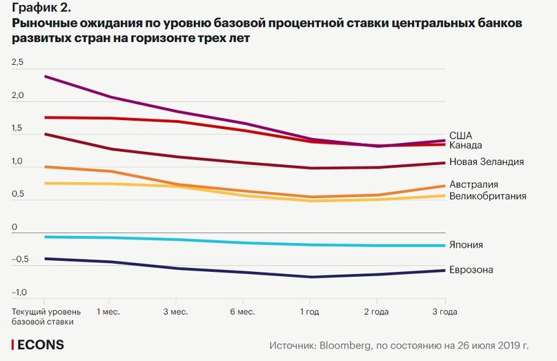 Еще раньше, чем ФРС, к смягчению денежно-кредитной политики перешел Резервный банк Австралии: в июне-июле он снижал базовую процентную ставку впервые с 2016 г., в общей сложности на 50 б.п. до 1% – это минимальный уровень с 1990 г. ЕЦБ поменял риторику в отношении дальнейших действий, рынок ожидает снижения депозитной процентной ставки ЕЦБ в сентябре. Сигналы других центральных банков и ожидания рынков предполагают, что в течение ближайших двух лет в большинстве развитых стран произойдет снижение процентных ставок (см. график 2).