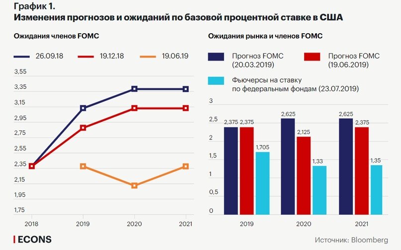 На очередном заседании 30–31 июля 2019 г. Федеральный комитет по открытым рынкам (FOMC) ФРС США из-за растущих опасений по поводу экономического роста принял решение снизить базовую ставку, хотя еще в конце 2018 г. члены Комитета ожидали продолжения начатого в 2017 г. ужесточения политики (процентная ставка была повышена три раза по 25 б.п. в 2017 г. и четыре раза – в 2018 г.). Теперь FOMC предполагает, что в 2020 г. ставки будут ниже, чем в 2019 г., ожидаемая траектория изменения базовой ставки находится на значительно более низком уровне, чем еще полгода назад, а рынок ожидает существенное смягчение уже в этом году (см. график 1).