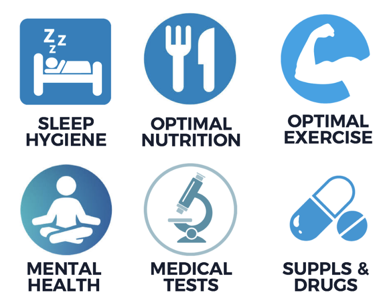 В итоге, были выделены 6 основных блоков: Гигиена сна, Оптимальное питание, Оптимальные физические нагрузки, Ментальное здоровье, Медицинские тесты, Добавки и лекарства.