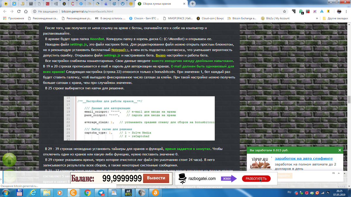 В 31 - 37 строках нужно задать время ожидания между сборами. Минимальное время ожидания на лунных кранах составляет 5 минут, bonusbitcoin.co - 15 минут, bitfan.co - 3 минуты. Я рекомендую выставлять не менее 30. За это время и монет больше накопится, и меньше внимания привлечем к аккаунту.