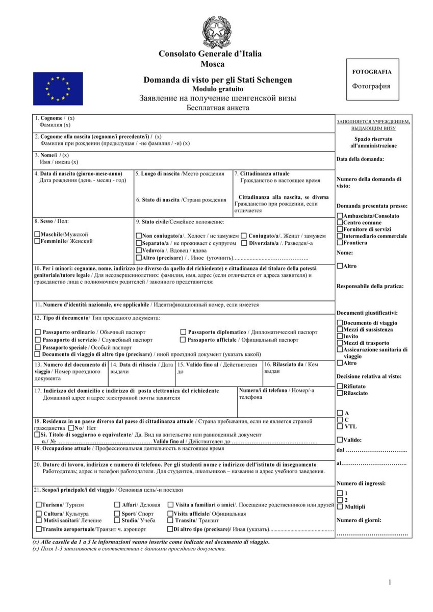 Ниже вы можете видеть бланк анкеты для получения визы в Италию. Распечатайте его и заполните. Заполняйте разборчиво, печатными буквами.
