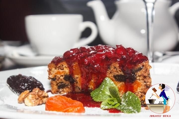 Quritilgan mevalar bilan tayyorlangan ajoyib pirog retsepti bilan tanishing. Pirog uchun foydalanilgan masalliqlar bir-biri bilan kirishib, nozik va ajoyib ta'mni sizga taqdim etadi. Har qanday dasturxonda o'zining yorqin o'rnini egallovchi pirog. Lazzatbaxsh ushbu pirogni albatta sinab ko'ring! Kerakli masalliqlar: Tayyorlash usuli: 1. Shakar, vanilin shakari, dolchin va olma sharbatini birlashtiring. 2. Oziq-ovqat sodasini limon sharbati yordamida o'ldirib oling va olma sharbati bilan birlashtiring va ko'pirtiring. 3. Yong'oqni maydalang va quruq tovada qovuring, sovuting. 4. Ko'pirtirilayotgan masalliqlar bilan unni uchrashtiring va aralashtiring. 5. Qora olxo'ri va o'rik qoqisini issiq suvda yumshating va quriting. So'ng, maydalang. 6. Mevalarni tayyorlangan xamirga soling. Pastdan yuqoriga harakatlangan holda aralashtiring. 7. Pishirish qolipini o'simlik yog'i bilan surting. 8. Xamirni quying va qolipni 1-2 marta silkiting. Pirogni 150 darajada qizdirilgan pechda 1 soat davomida