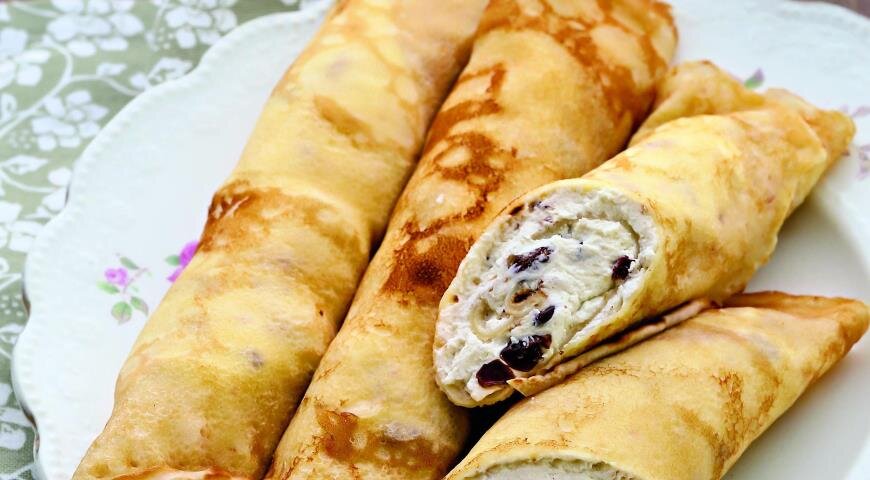 Порадуйте домашних в выходные супервкусным завтраком, под ароматным ванильным соусом. Для приготовления 4 порций вам понадобится: Блинчики: .100 г муки .250 мл молока .2 яйца .40 г сахара .1 щепотка соли .40 г сливочного масло Для начинки: .3 стол. ложки рома .3 стол. ложки изюма .2 яйца .2 стол. ложки размягченного сливочного масла .75 г сахара .1 стол. ложка тертой лимонной цедры .250 г творога .100 г ягодного конфитюра Для соуса: .1 яйцо .125 мл молока . 1 стол. ложка сахара . 1/2 пакетика ванильного сахара Начинаем готовить : 1. Муку просеять . Из яиц , молока, сахара, соли и муки приготовить тесто и дать ему настоятся в течении 30 минут. 2. Пока настаивается тесто не теряя времени , готовим начинку. Перебираем изюм , замачиваем его в роме. Яичные белки отделить от желтков. Масло тщательно взбить в пену с сахаром и лимонной цедрой . Добавить яичные желтки , творог и изюм вместе с ромом. Белки взбить в крутую пену и добавить в яичную-масляную массу. Духовку нагреть до