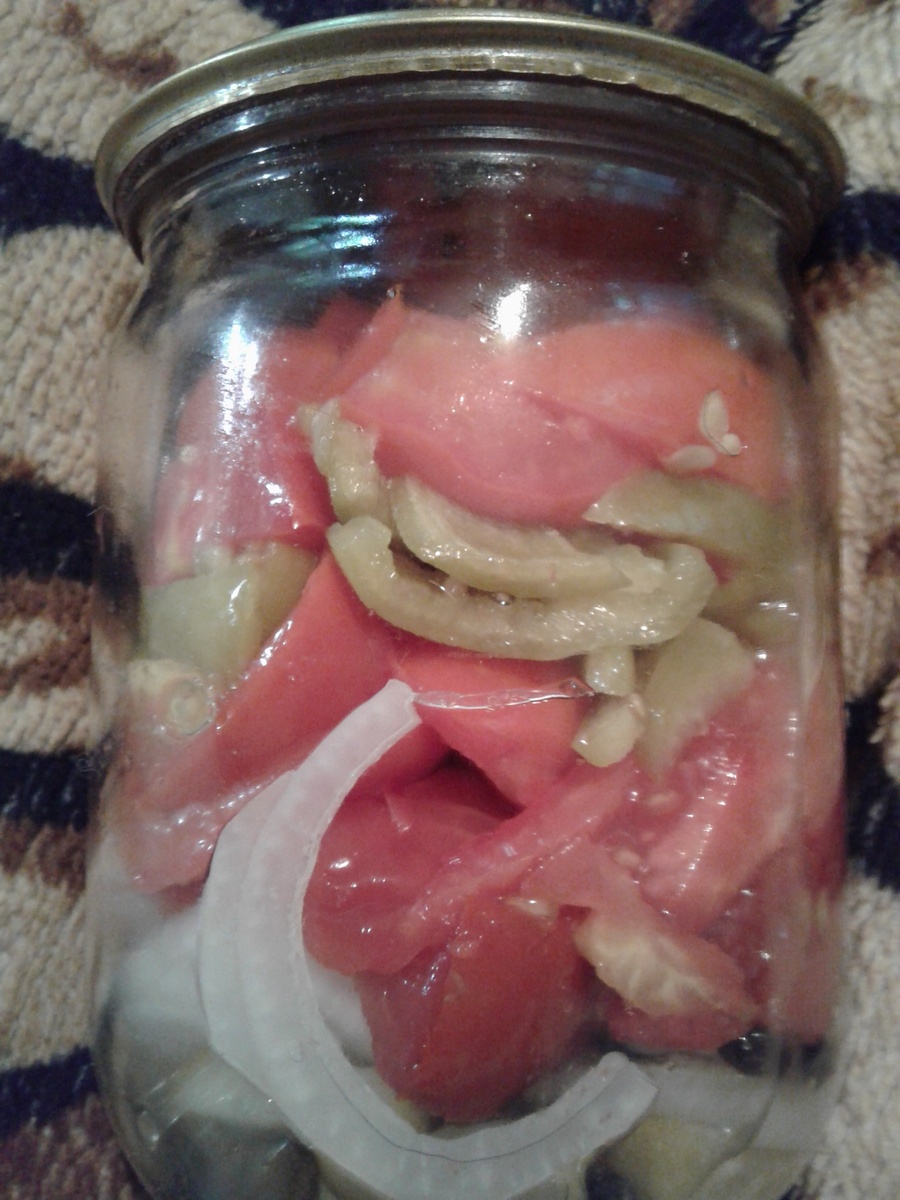 В стерильную баночку 1 литр положить на дно 4 веточек укропа и петрушки (зеленые) 1 зубок чеснока колечко горького перца 1 луковицу порезать кольцами 1 сладкую перчину порезать соломкой помидоры Овощи при закладке немного утрамбовывать. Затем сверху положить 4 шт. душистого перца, 2 гвоздички, 1 лавровый лист. Готовим рассол: