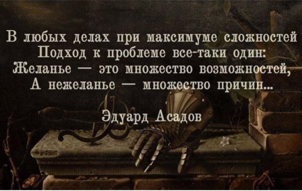 ... Который раз убеждаюсь в истинности слов - КОМУ РЕАЛЬНО НУЖНО - НАХОДИТ ВОЗМОЖНОСТЬ.... КОМУ НЕ ОСОБЕННО НУЖНО - НАХОДИТ ОПРАВДАНИЕ!!! Мне лично кажется, что честная встреча и осознание своей настоящей реальности - даже если она в чем-то не совсем удобна и приятна - всегда ресурснее и потенциальнее, чем желание убежать от неудобной реальности в иллюзорное "хорошо"... И еще - я понимаю, что если не шевелить своим "задом", то зад "прирастает" к месту.. "пускает корни"... И "оторвать" его потом все сложнее и сложнее!!! Лично я благодарен своим проблемам в моём прошлом... Если бы они меня не напрягали - я бы так и не разобрался с ними... И не научился бы многому тому, что на сегодняшний день осознаю и умею... Но все начиналось с готовности честно встретиться со своей "неудобной и некрасивой" тогдашней реальностью...