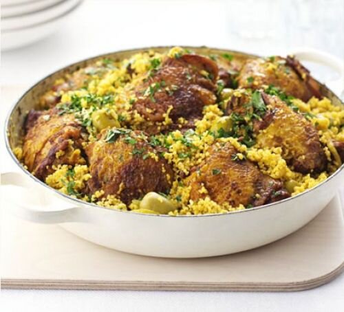 - Бросьте куриные бедра пополам специями и щепоткой соли до полного покрытия. Разогрейте 1 столовую ложку масла в большой сковороде с крышкой. Обжарить курицу кожей вниз, в течение 10 минут до золотистого цвета, перевернуть, затем варить в течение 2 минут, прежде чем снимать со сковороды. Вылейте оставшееся масло в кастрюлю, затем обжарьте лук и чеснок в течение 8 минут до золотистого цвета. Добавьте остальные специи, затем варите еще 1 минуту. Полить куриным бульоном и посыпать оливками. Доведите все до кипения, убавьте огонь, затем положите курицу на бульон в кастрюлю.