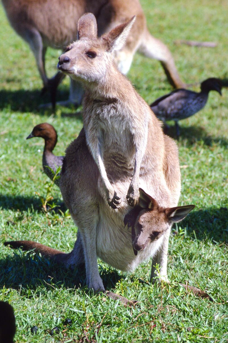 Слово «кенгуру» происходит из кууку-йимитирского языка австралийских аборигенов, которые называли этих животных «kanguroo» или «gangurru». Когда капитан Джеймс Кук со своей командой впервые узнал об этом животном и увидел детёныша кенгуру, высунувшего голову из кармана своей матери, он сначала подумал, что кенгуру — это двухголовые животные. 1. Кенгуру обитает в Австралии, в Тасмании, на Новой Гвинее и на архипелаге Бисмарка. Завезены в Новую Зеландию. Численность кенгуру в Австралии колеблется около отметки 20 млн и даже превышает численность людей на этом континенте. Кенгуру является символом Австралии и даже изображен на гербе Австралии, в компании со страусом Эму. Эти исконно австралийский животные были выбраны еще и потому, что они оба не могут пятиться назад, и продвигаются всегда только вперед. 2. Мощные задние лапы дают возможность кенгуру отлично прыгать, а баланс во время бега животное держит благодаря своему хвосту. Интересно, что сумчатое способно развивать скорость д