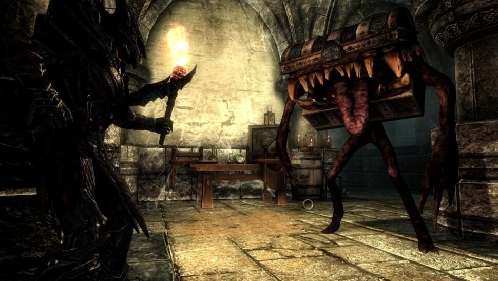 Боже мой, просто посмотрите на это! Мимики - ужасные существа, обманывающие невнимательных искателей приключений и превращающие их в закуску. Этот мод для Skyrim похоже самый абсурдный из всех. Идея скопирована с серии игр Dark Souls. Ни одна часть которой не вызывала бы у меня невероятный страх, но меня беспокоит тот ужасный, противный язык, от которого у меня крутит живот. Мододел Михаил создавал этот мод для оригинальной версии Skyrim, но недавно он был портирован для Skyrim Special Edition, позволяя вам снова испытать эти ощущения в подземельях. Вы можете скачать его здесь. Другие существа из зверинца Михаила включают в себя прекрасных летающих скатов и этого пугающего робота. Он большой, злой, дышит огнем, но не такой страшный, как мимик.